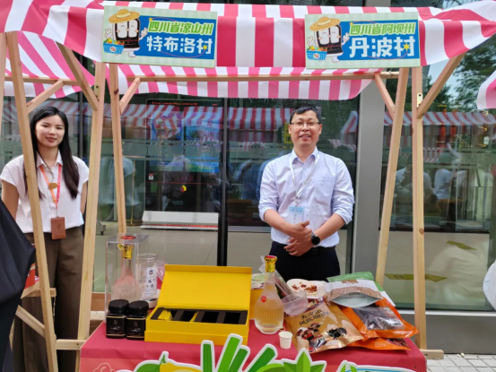 ▲東方電氣集團駐昭覺縣特布洛村第一書記楊振攜大涼山的苦蕎茶、烏金豬臘肉香腸等特色農(nóng)產(chǎn)品亮相人民日報社“駐村市集”