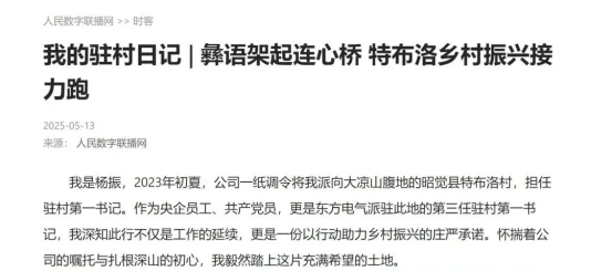 近日,“牢記囑托 駐村興農(nóng)”駐村第一書記交流會暨2025年版《駐村第一書記說》專欄發(fā)布會在北京人民日報社舉行。東方電氣集團應(yīng)邀參加,駐昭覺縣特布洛村第一書記楊振參會,與來自全國10余個省份的駐村第一書記、專家學者、企業(yè)代表及媒體記者,就黨建引領(lǐng)、產(chǎn)業(yè)融合、數(shù)字化賦能等鄉(xiāng)村振興關(guān)鍵議題展開深入交流。